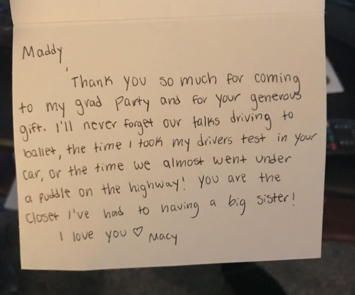 «Медді, спасибі тобі величезне за те, що прийшла на мій випускний і за такий щедрий подарунок. Я ніколи не забуду наші розмови в машині про балет, то, як я вчилася водити на твоєму авто, або як ми ледь не провалилися в калюжу на трасі. Ти ніби моя старша сестра! З любов'ю, Мейсі».