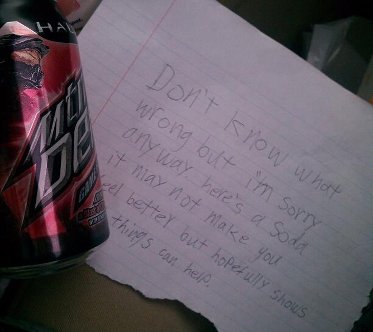 «Не знаю, що не так, але я співчуваю вам у будь-якому випадку. Ось газована вода. Можливо, від неї вам не стане краще, але, може, вона підкаже, що може допомогти».