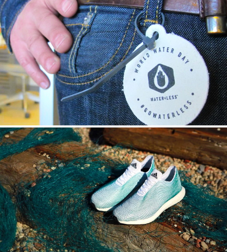 Levi's — перший бренд, який випустив экоденим і джинси зі знаком Waterless, що означає економію води на етапах виробництва. Компанія Adidas створює колекції экокроссовок зі сміття і рибальських сіток, зібраних в океані. А NIKE з 1993 року реалізує проект Reuse-A-Shoe — переробка взуття для створення бігових доріжок і кортів. Більшість фірм перейшли на пакети і сумки, що розкладаються протягом 2 років.