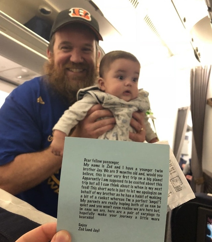 9. «Цей чоловік — батько близнюків. Це їх перший політ, і тато вирішив роздати пасажирам беруші з запискою»
