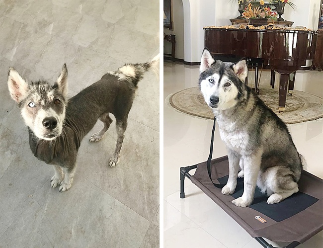 Місяць знайшли близько 8 місяців тому, і в ній було важко визнати породисту сибірської хаскі: вона була дуже худою, а з-за корости на ній майже не залишилося вовни. Але завдяки любові і турботі нового власника ця собака знову стала пухкою і щасливою.