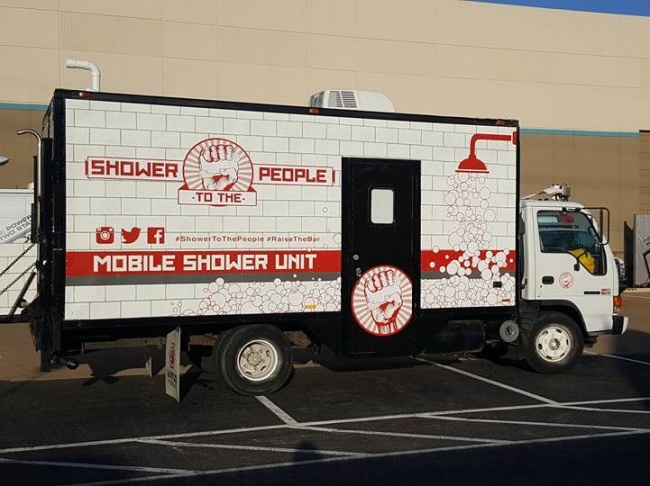 Старий вантажівка за $ 5 000 Джейк перетворив на мобільний душову, яку можна дізнатися по напису «Душ для людей». Вода береться з пожежних гідрантів та підігрівається за допомогою зовнішнього генератора.