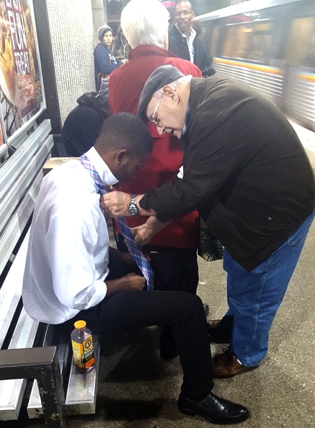 Молодий хлопець сидів на станції метро і ніяк не міг правильно зав'язати краватку. Стоїть поруч жінка в червоному пальто помітила це і попросила свого чоловіка навчити хлопця правильно зав'язувати краватку. Чоловік без вагань покроково показав, як потрібно це робити.