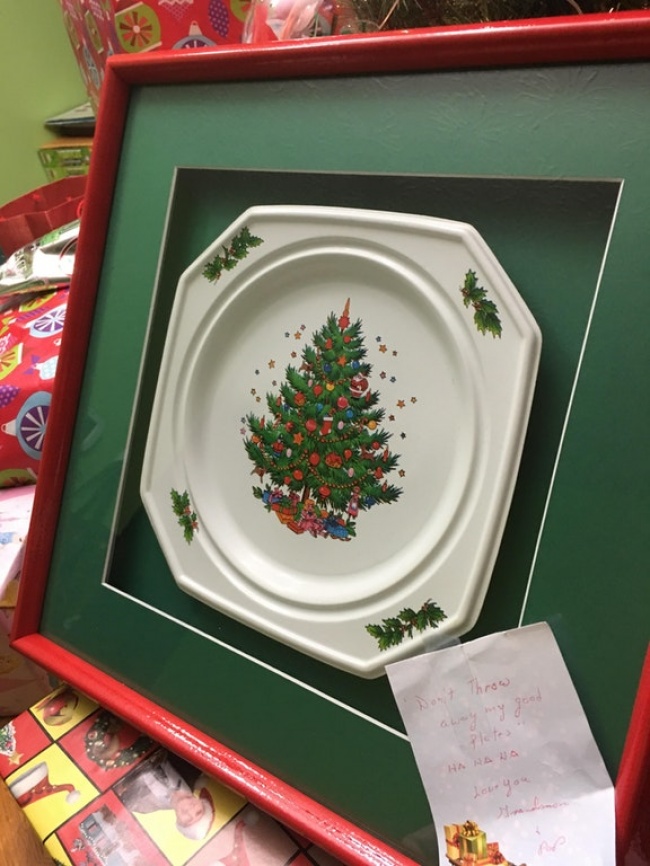 «Протягом 30 років моя бабуся використовувала ці пластикові тарілки на Різдво. Після минулого року у неї залишилося всього 7, тому вона помістила їх в рамочки і віддала кожному з 7 своїх онуків».
