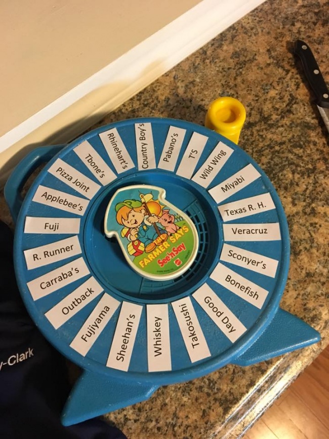 Джаред Бейкер і його батько Джеррі втомилися нескінченно вибирати закладу, щоб повечеряти з дівчиною. І тоді вони знайшли просте рішення: покластися на долю. В даному випадку долею (або «розподіляє капелюхом», якщо хочете) стала стара іграшка The Farmer Says.