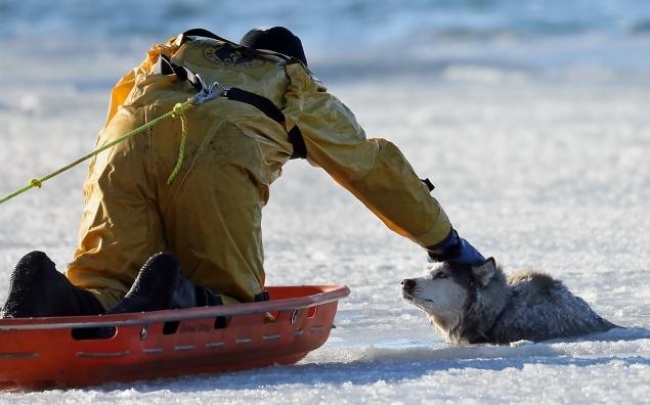 Бостонський пожежний Шон Коул наважився під'їхати до Сільвії, 13-річної собаці породи хаскі, на ковзанах по вкрай нетривкого льоду. В результаті собака була врятована на радість господаря.