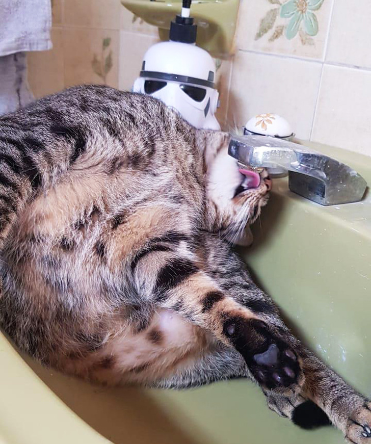 «Моя дурна кішка любить пити воду так: опускає живіт в миску з водою і потім злизує краплі зі своєї шерсті»