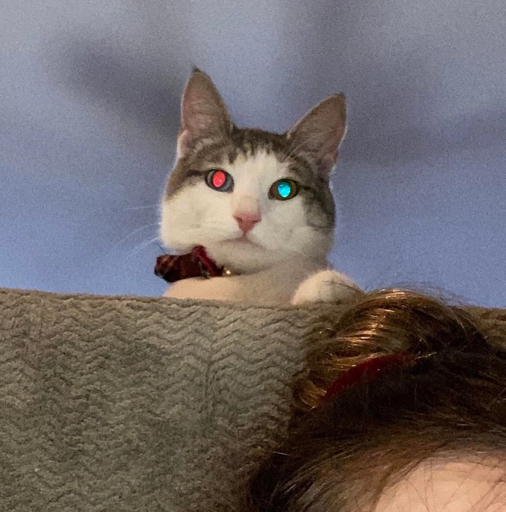 3. У цього кота один очей блакитний, а інший — коричневий. А ось так він виглядає на фото зі спалахом