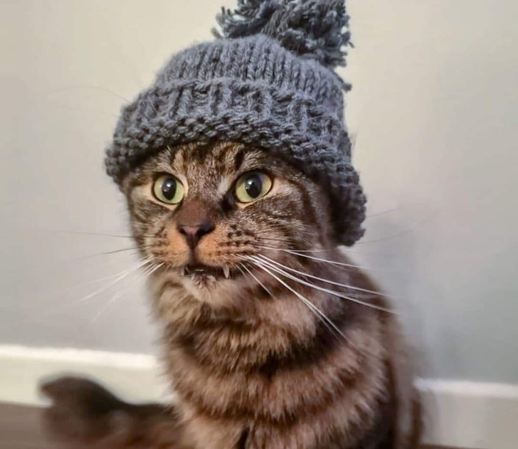 «Моя жінка зв'язала свою 1-ю шапку, але вона вийшла занадто маленькою. Зате ідеально підійшла кішці»