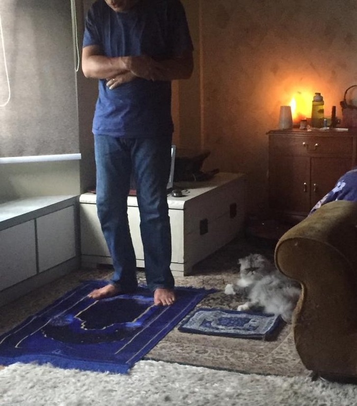 «Мама надіслала фото того, як папа намагається позбавити себе від докучань кота під час молитви. Подарував йому власний молитовний килимок. Начебто працює».