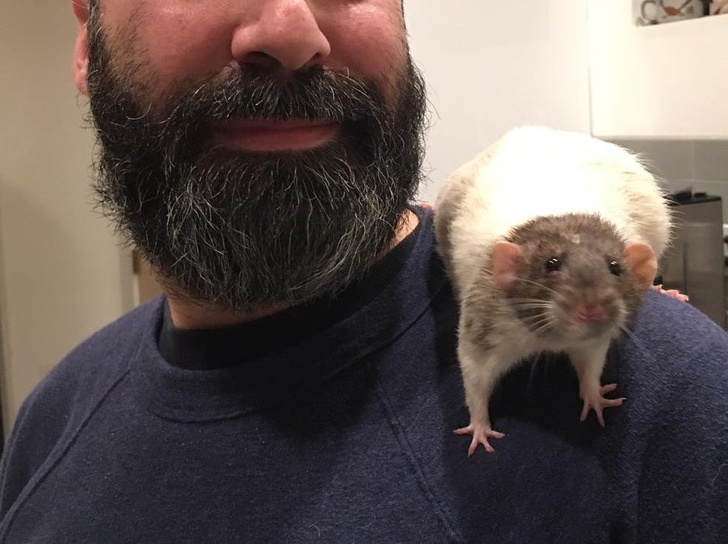 «Коли ми вперше придбали щурів, мій чоловік наполіг, щоб вони були „моїми“ домашніми тваринами. Зараз вони з Лампочкою не розлий вода, і вона любить кататися на його плечі»