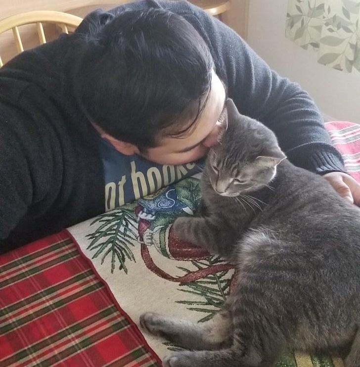 «Раніше він не хотів кішку. А тепер йому сумно залишати її вдома одну, поки ми їдемо у відпустку. На фото він співає кішці діснеївські пісні. Якщо це не любов, тоді я не знаю, що це!»
