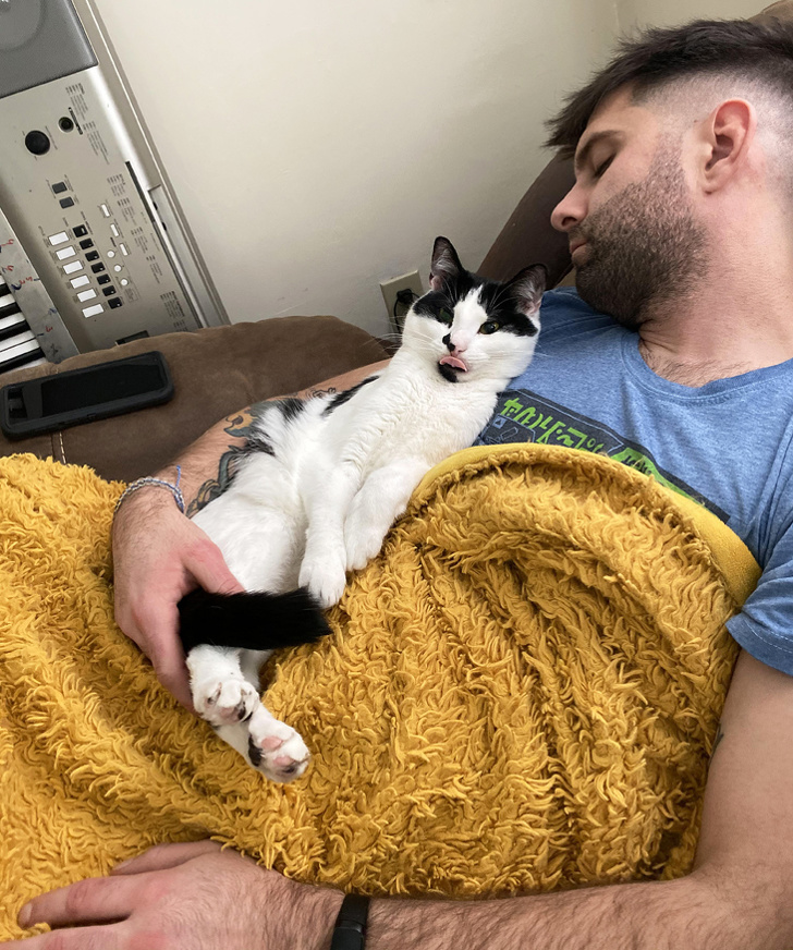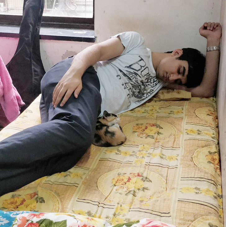 «Це спить мій сусід по квартирі поруч з нашим новим кошеням. Тепер ця дівчинка — наша королева»