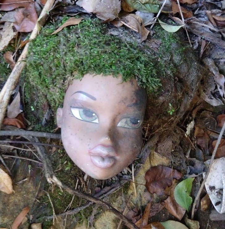 Голова ляльки лежала біля струмка. Мох росте на ній прямо як волосся
