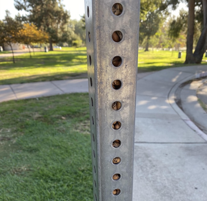 Білка набила жолудями стовп дорожнього знака, щоб підготуватися до зими