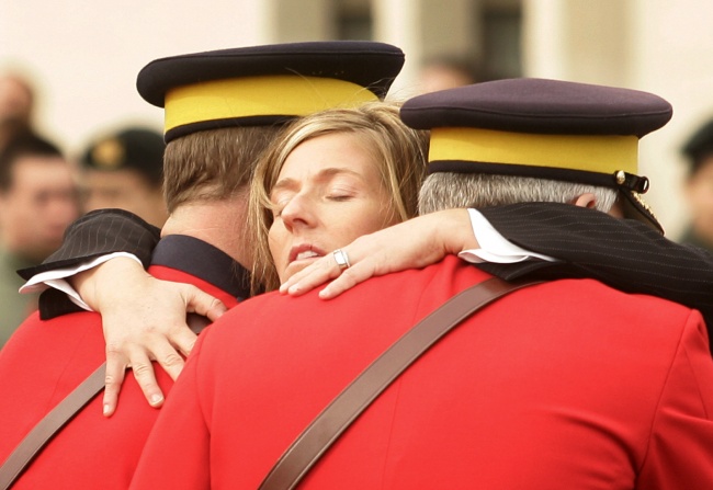 Келлі Джонстон, дружина загиблого офіцера королівської канадської кінної поліції, обіймає офіцерів під час похорону чоловіка.