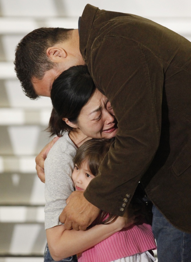 Американська журналістка Юна Лі обіймає свого чоловіка і дочку після того, як її незаслужено тримали під арештом у Північній Кореї 2 місяці.