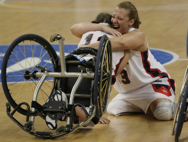 Члени збірної США з параолипийскому баскетболу Христина Рипп і Лорейн Гонсалес відзначають перемогу над командою Німеччини.