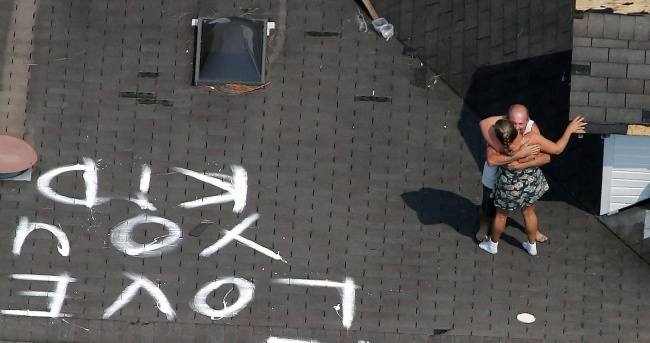 Парочка, яка постраждала під час урагану «Катріна», обіймається на даху в Сейнт Бернард Періш.