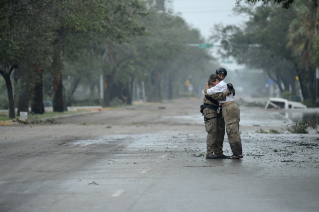 Член пошуково-рятувальної групи втішає мешканку Гальвестона після урагану.