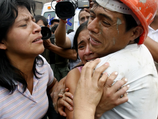 Робітник, який вижив після катастрофи бетонної стіни в Лімі, обіймає свою сестру.