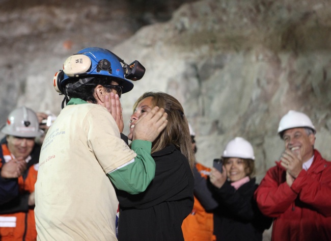 Потрапив під обвал чилійський шахтар обіймає свою дружину після звільнення з 68-денного полону.
