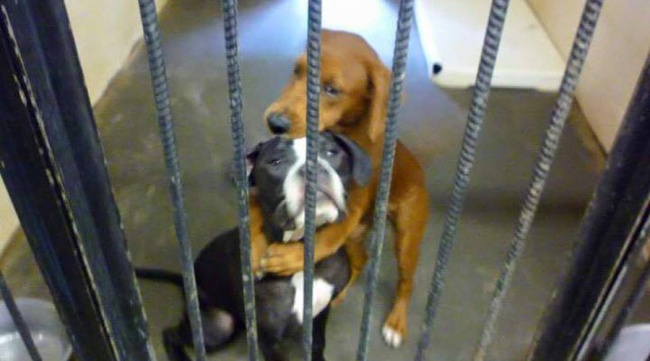 Двох собак, Калу і Кіру, які містилися в притулку, повинні були приспати найближчим часом. Обійми врятували їм життя — цю фотографію розмістили в фейсбуці, і вже через 2 години і 6 хвилин для них знайшлася прийомна сім'я.