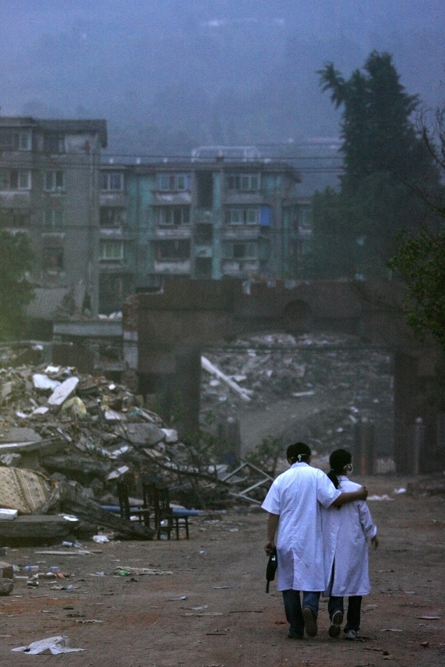 Медичні працівники бродять серед зруйнованих землетрусом будівель в китайській провінції Ханванг.