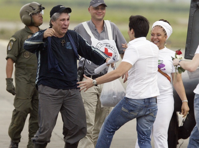 Колишній колумбійський заручник Сигифредо Лопес біжить назустріч синові. Він пробув у полоні 7 років.