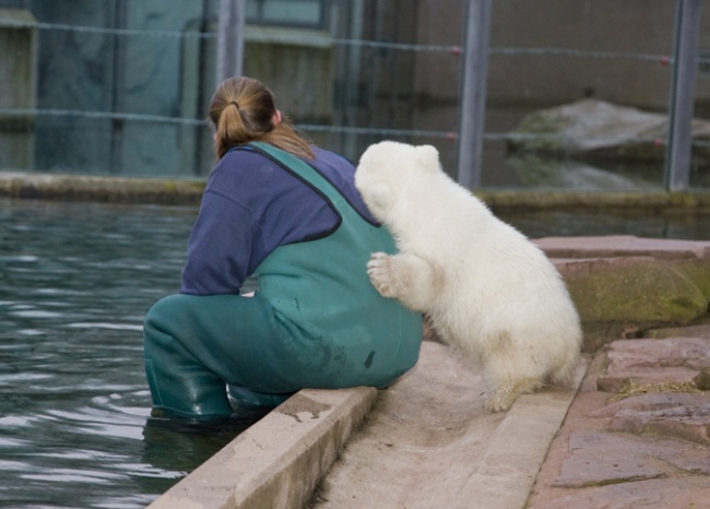 Білий ведмедик Флоки обіймає співробітника зоопарку Стефані Крюгер.