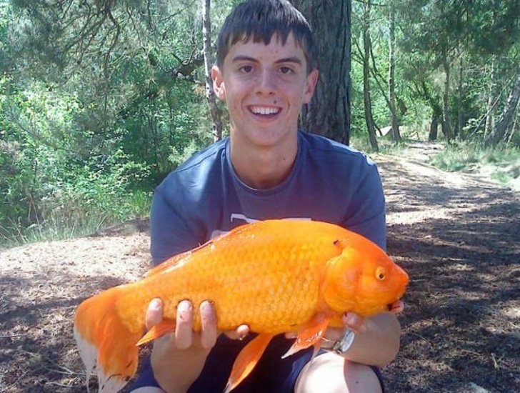 Школяр з Дорсета Нік Річардс зловив по-справжньому чарівну золоту рибку, довжина якої становить 40 см. І це ще не межа. Досі достеменно не відомо, як таке диво могло опинитися в звичайному озері. За однією з гіпотез, колишній власник Біллі (так хлопець назвав рибу) викинув її у водойму, де вона зросла до рекордних розмірів.