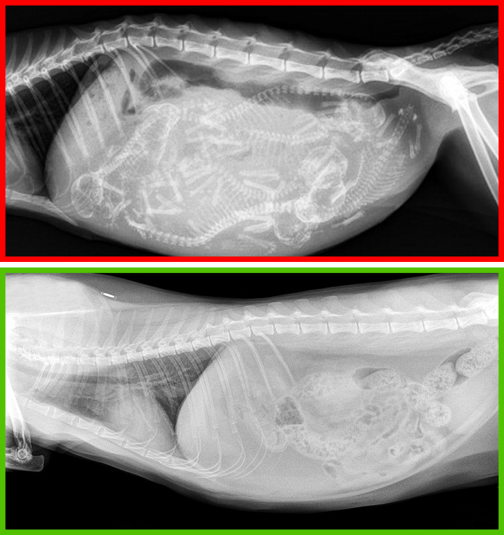 Вгорі — рентгенівський знімок вагітної кішки, внизу — кастрованого кота.
