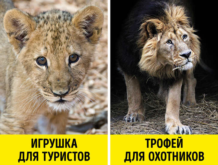 Замість слова "звіринець" хитрий підприємець напише на вивісці "центр дикої природи" або "приватний заповідник". Тут відвідувачам покажуть трюки мавп і дозволять погодувати з пляшечок левенят. Дорослих особин, з якими вже так не пограєш", потім продадуть, щоб мисливці змогли отримати свій африканський трофей, адже такі ручні звірі навіть не тікають, побачивши людину.