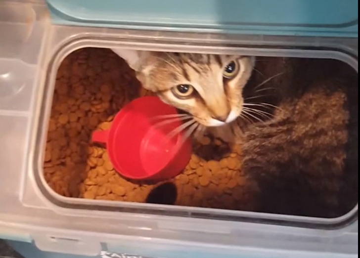 "Собаки вили біля своєї коробки з їжею. Виявляється, наша нова кішка вирішила привласнити їх корм. Абсолютно безсоромна"