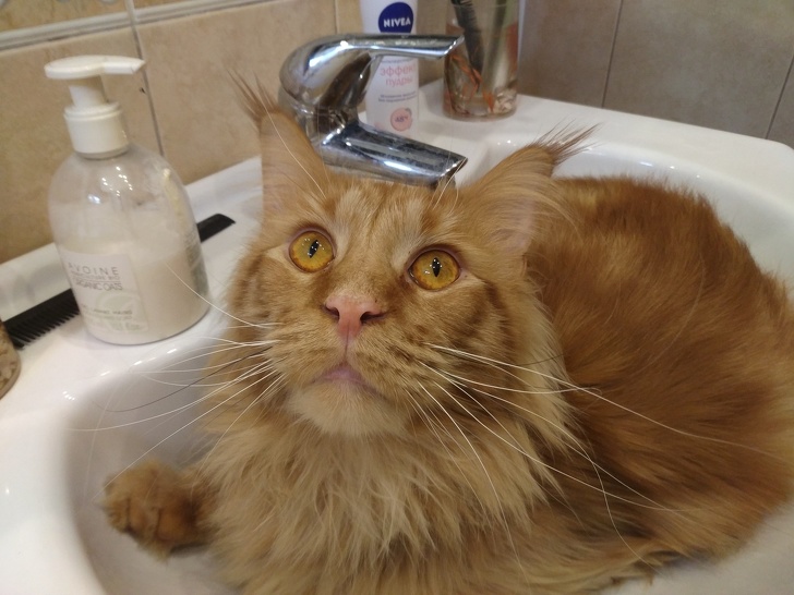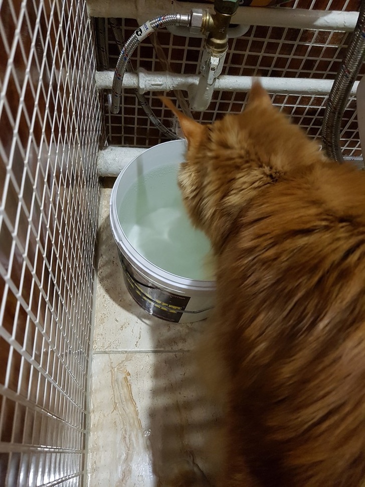 Часто мейн-куни, «відкопуючи» питво, перевертають макітру і заливають підлогу. Хтось покірно витирає все це, хтось- поміщає миску у ванну або раковину, хтось- ставить котику велике відро, яке нереально перевернути. Наш вихованець, коли бачить велику тару з водою, воліє занурити в неї лапу і пити «з долоньки».
