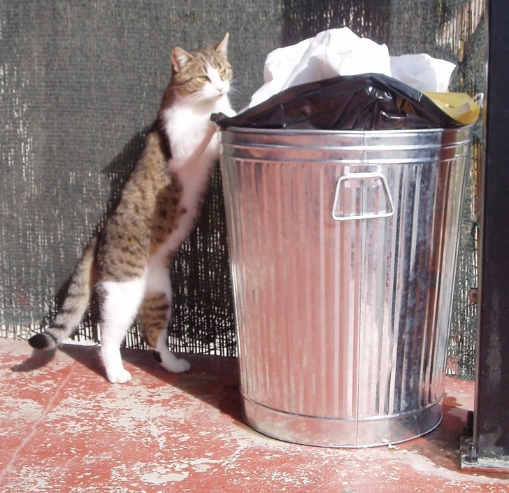 - Компульсивное переїдання. Його ще називають «синдромом блокадників», коли тварина відчуває голод постійно. Кішці обов'язково потрібно щось поцупити, випросити, витягнути зі сміттєвого відра, тварина поїдає навіть нетипові і шкідливі для себе продукти. Потрібно обмежити доступ до відра для сміття, не залишати нічого з людської їжі, проаналізувати склад корму, щоб зрозуміти, чи дійсно тварина їм наїдається або присутня певна нестача необхідних речовин.