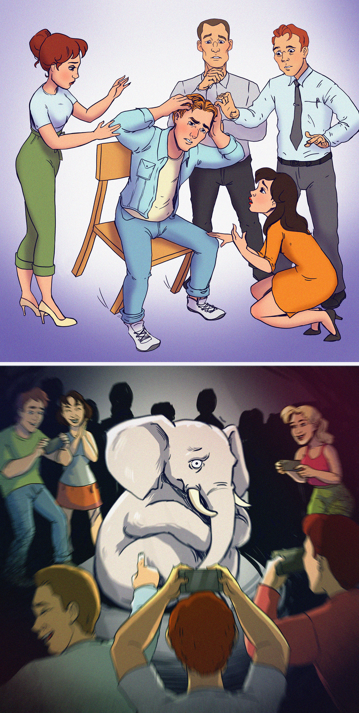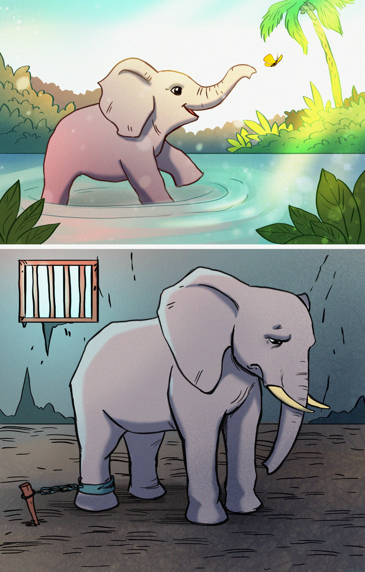 Можливо, ви чули або бачили забавне погойдування слона з боку в бік? Ні, йому не весело. Це наслідок сильної психологічної травми. Слони — соціальні тварини, і їм необхідна постійна взаємодія із собі подібними. Позбувшись цього, вони відволікають себе від самотності ось таким «забавним» способом.