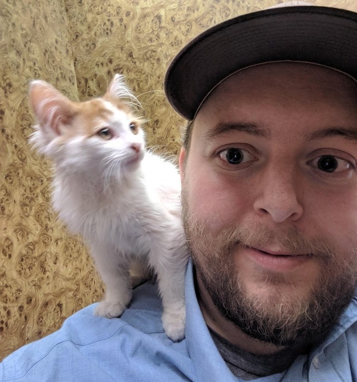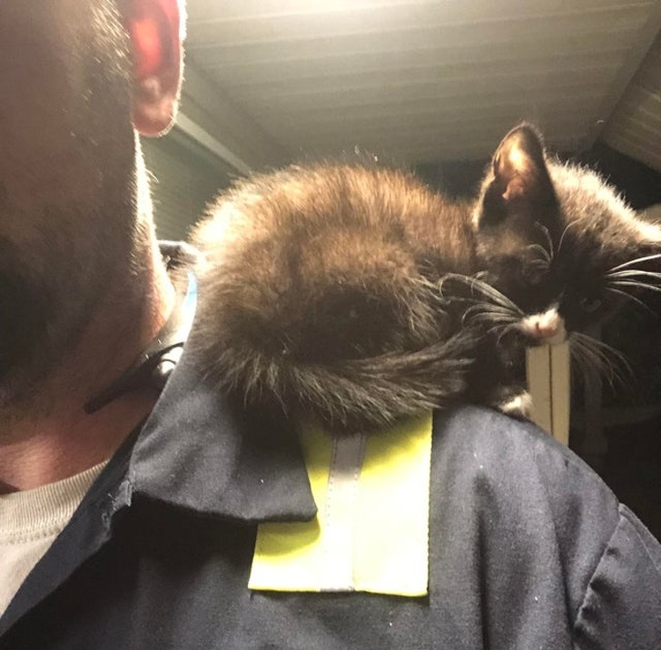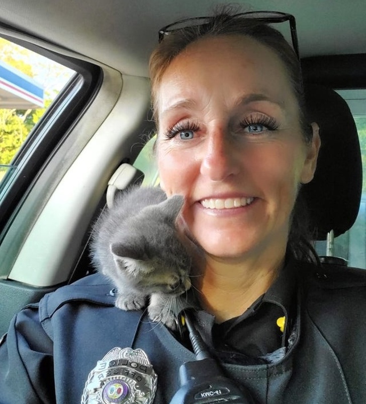 «Минулої ночі працювала в пробці через масштабної аварії. Почула тихе „няв“. Я запалила свій ліхтарик і побачила два світяться очі, що дивляться на мене. Я мяукнула у відповідь. Цей крихітний кошеня заповз на мою ногу і сів на моє плече».