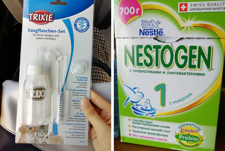 - Ні в якому разі не коров'ячим молоком, забудьте про нього, так як його не можна таким малюкам. Годувати потрібно, наприклад, замінником котячого молока для кошенят, його ви можете придбати у ветеринарних клініках або в ветмагазине. Коштує близько 500 рублів. Інструкція по використанню і дозування є на упаковці. Суворо дотримуйтесь зазначені заходи.