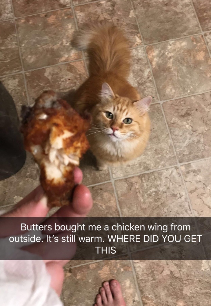 «Баттерс приніс мені з вулиці куряче крило. Воно все ще тепле. Де ти його дістав?!»