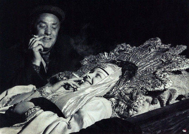 Кадр зі зйомок фільму Сергія Ейзенштейна «Іван Грозний». Малюта Скуратов (актор Михайло Жаров) біля труни цариці Анастасії (актриса Людмила Целіковська). Перекур.