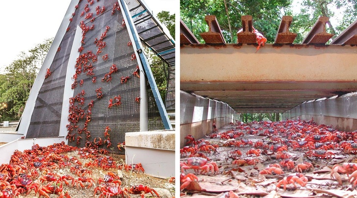 На острові Різдва в Австралії сезон між жовтнем і груднем відомий як сезон дощів. У цей час близько 50 млн червоних крабів залишають свої домівки і відправляються до океану, щоб відкласти яйця. На ці місяці влада навіть закривають деякі дороги, тому що багатьом тваринам доводиться їх перетинати. Щоб допомогти якомога більшій кількості крабів дістатися до води, люди побудували 5-метровий пластиковий міст. Він допомагає крабів орієнтуватися і безпечно перетинати небезпечні ділянки.