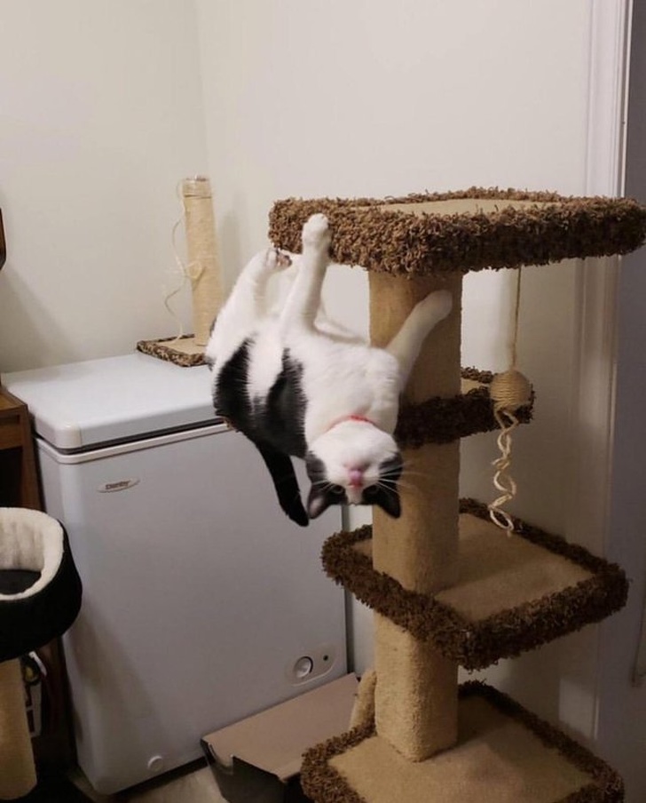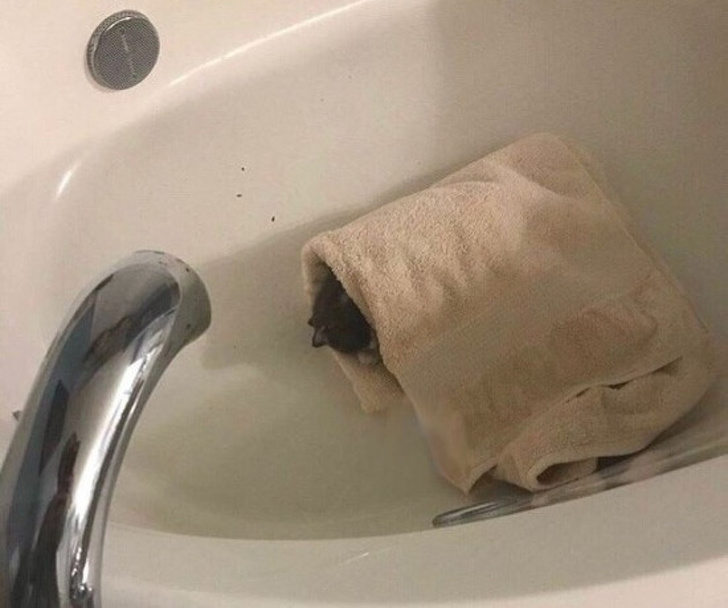 Стрибнув у ванну, випадково зачепив рушник. Замість того, щоб якось вирішити проблему, вирішив нічого не робити і трішки подрімати