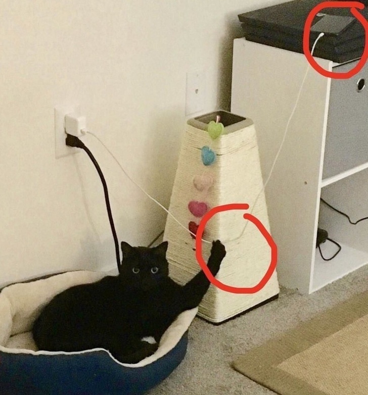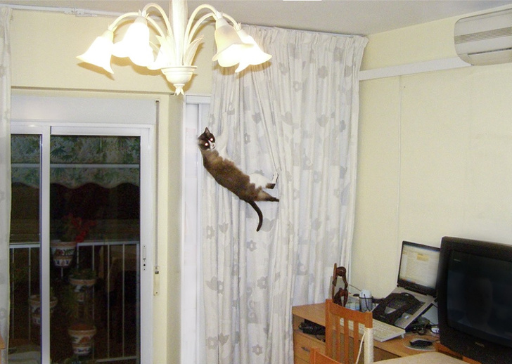 «Так, це я робив затяжки і дірки на шторах. А тепер зачепився і не можу злізти. Господар, допоможи!»