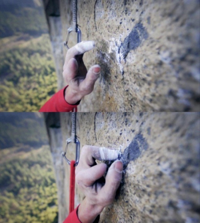 Професійний скелелаз чіпляється за найменші нерівності на прямовисній стіні.