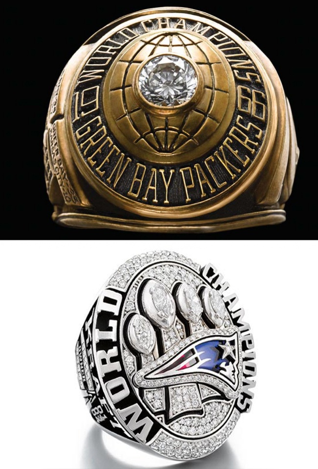 Переможцям Суперкубка США з американського футболу видають ось такі персні. Верхній — з самої першої серії. Нижній — з останньої, за 2015 рік.