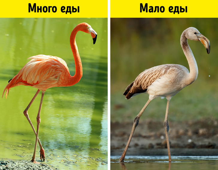 - Якщо у фламінго недостатньо їжі, їх пір'я можуть стати сірими. Вся справа в тому, що ці птахи рожеві не від народження, а з-за особливостей харчування. Вони їдять синьо-зелені морські водорості, які в процесі перетравлення стають рожевими, і це впливає на колір оперення птахів. У яєць фламінго іноді навіть жовтки бувають рожевими.