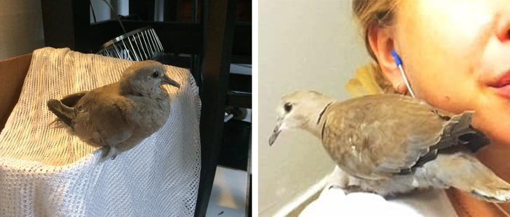 «Підібрали пташеня без пір'я на крилі. Коли підростав, любив сидіти на голові під ковдрочкою. Через 2 місяці диво зросла в сизокрылого голуба. Випустили з почестями, але на обід іноді залітає»