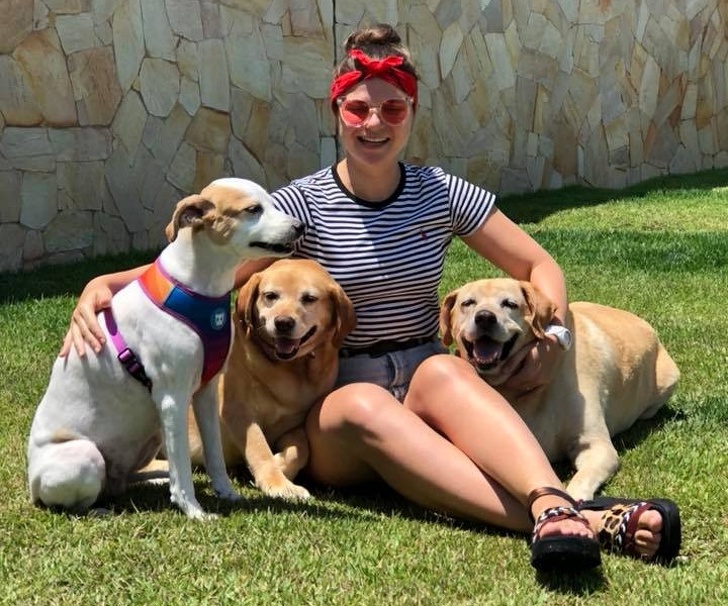 «Білу дворняжку Місяць чоловік підібрав цуценям на вулиці. Лабрадора Мел господарі викинули на зупинці, вона прочекала їх там 2 роки, не сходячи з місця. Другий лабрадор, Сьюзі, належала людям, які використовували її для виробництва цуценят на продаж. Я відібрала її у „господарів“ і виходила, так як вона дуже хворіла і майже не ходила».