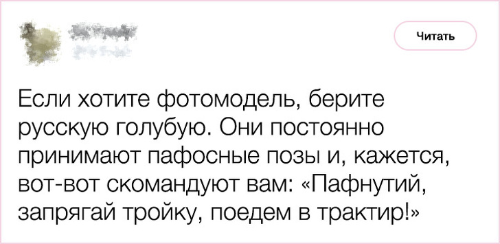 - Сама пекельна суміш, яку я бачила, — помісь перса з ангорой. Краса неймовірна, але в цій кішці злопам'ятність персів чудесним чином поєдналася з винахідливістю і енергією ангори. Вона могла б бути прототипом Ракети в «Вартові Галактики». Для ілюстрації. Як тільки господиня виходила, це біле хмара вплывало в кімнату, оцінювало тебе на предмет цікавих предметів. Потім воно переміщалося до стільця, який заборонялося дряпати. Дряпало його рівно 4 рази і видалялася так таємниче, що хотілося перевірити гаманець.